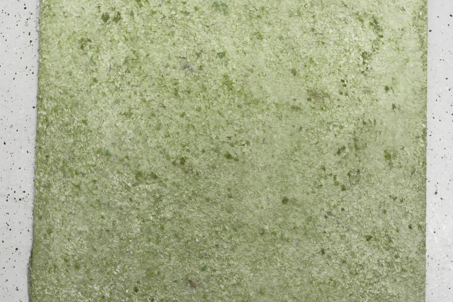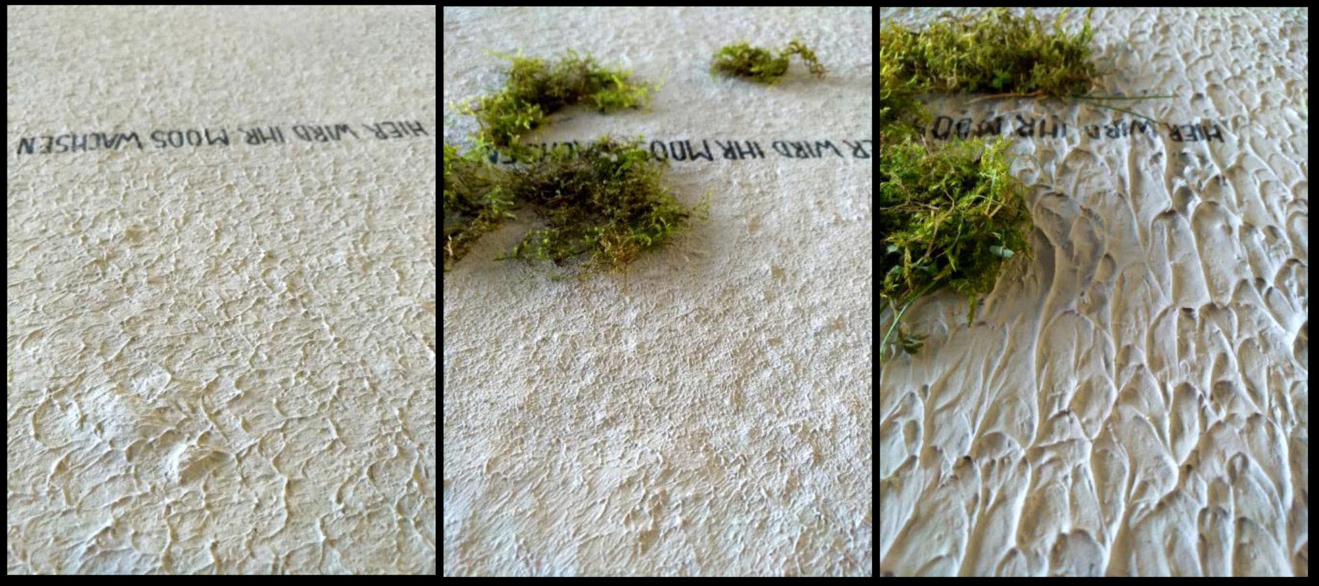 Besonders erfolgreich war das Aufrollen einer schlammigen Zementmasse mit Walzen unterschiedlicher Florhöhe. Durch Layering, Variation der Viskosität und Nass-in-Nass-Verarbeitung entstanden offenporige, reliefartige Strukturen, die in Haptik und Anmutung natürlichem Bewuchs ähneln und potenziell geeignete Mikrostrukturen für Anhaftung und Wachstum bieten.