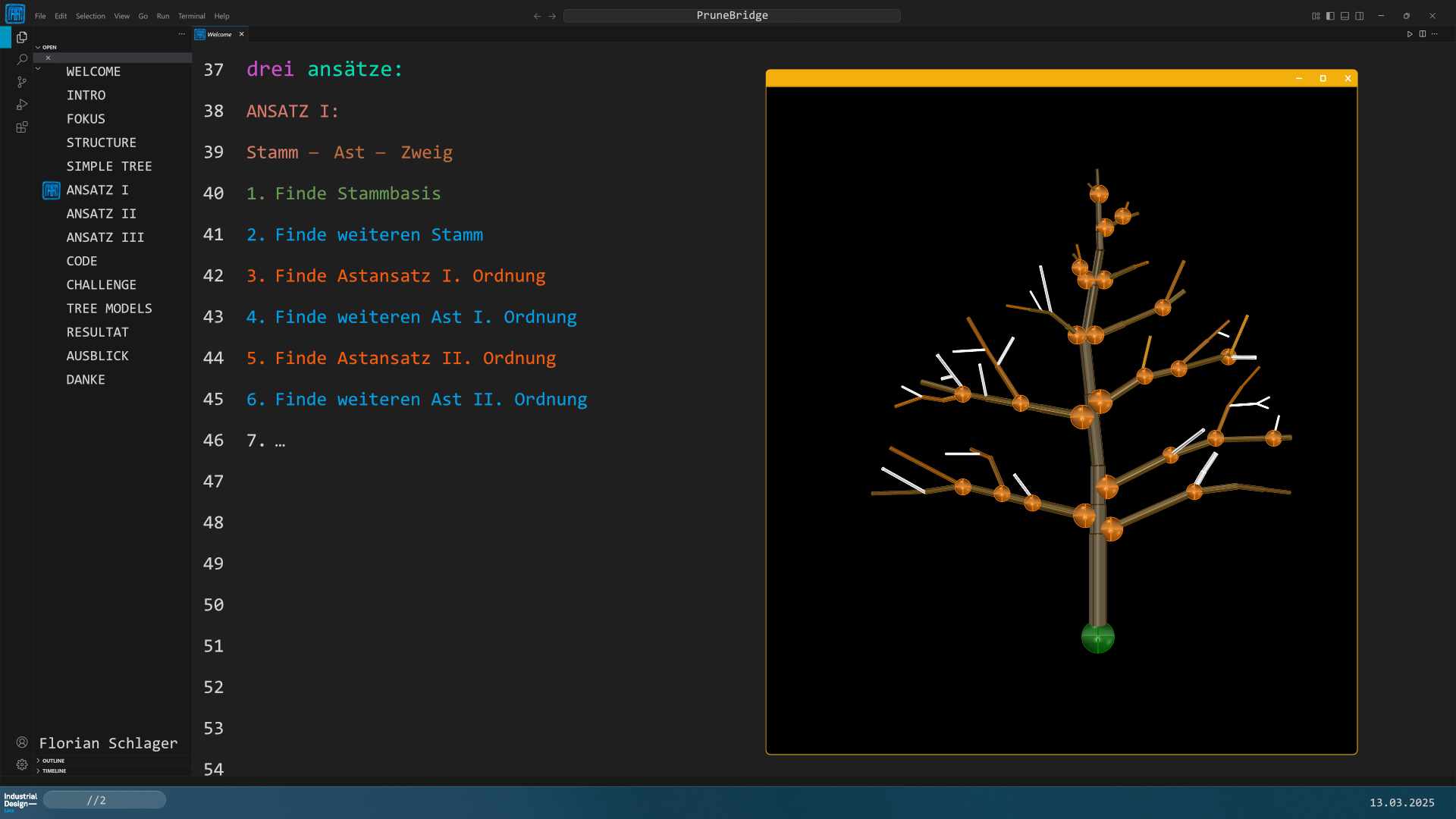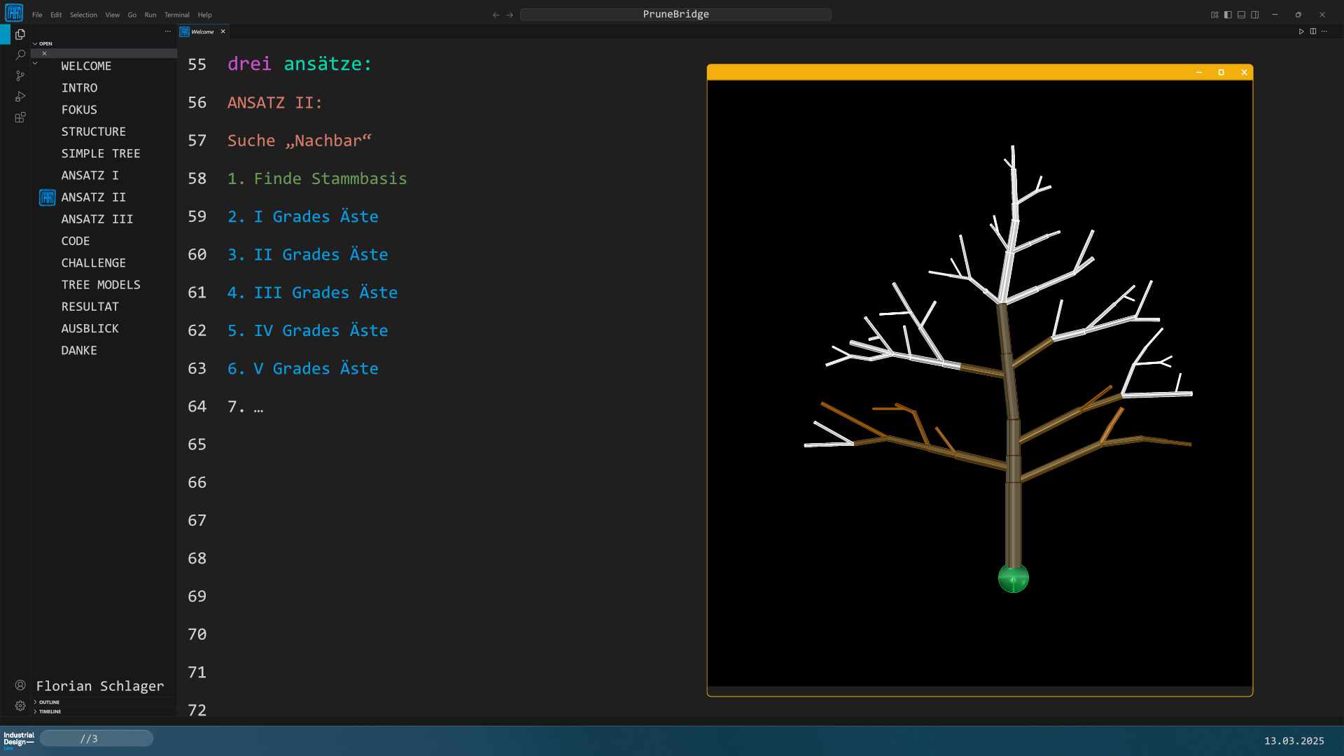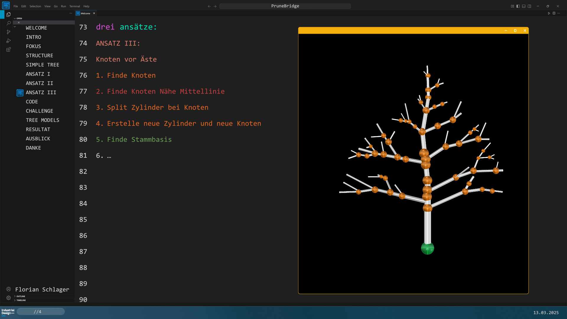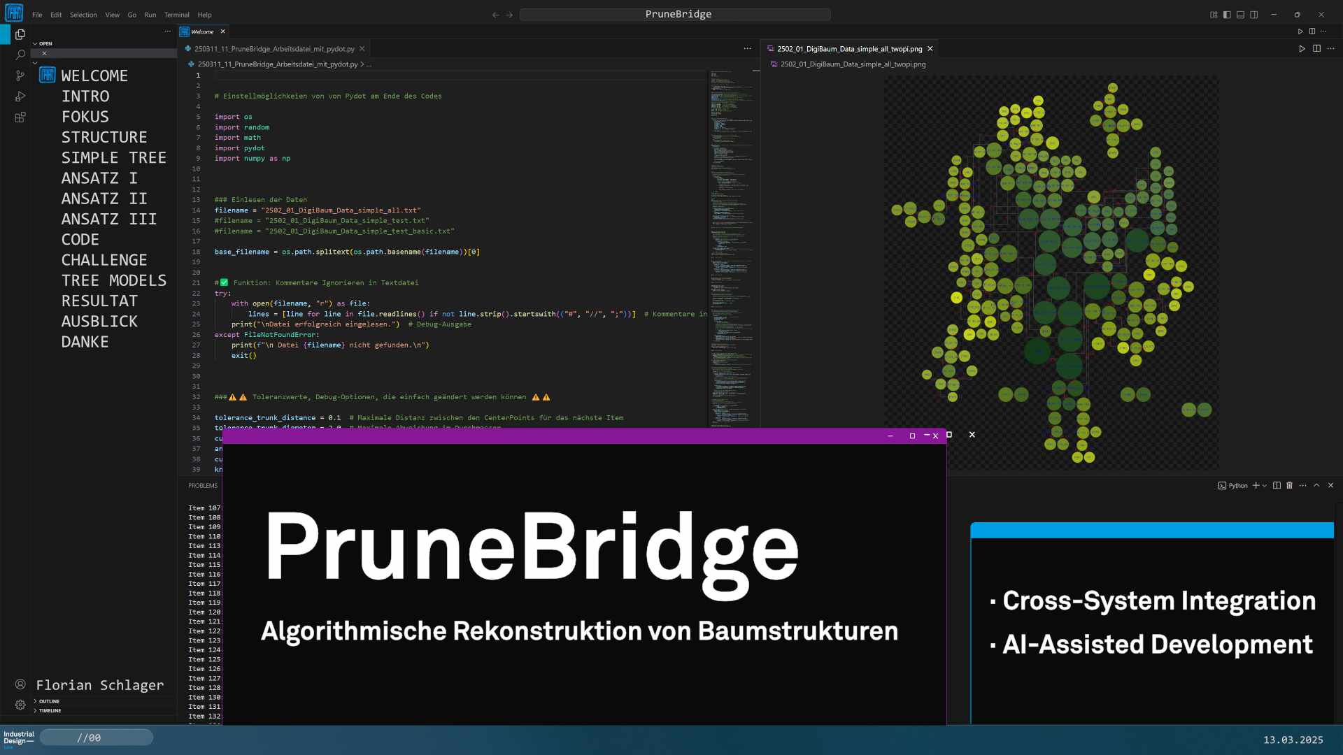 Neben der geometrischen Rekonstruktion stand insbesondere ein technischer Schwerpunkt im Vordergrund: die Arbeit mit Schnittstellen zwischen unterschiedlichen Programmen, Systemen und Datenformaten. Die Pipeline reichte von TLS-Scans über QSM-Modelle bis hin zur Weiterverarbeitung in Rhino/Grasshopper und einer eigenständig entwickelten Python-Struktur.