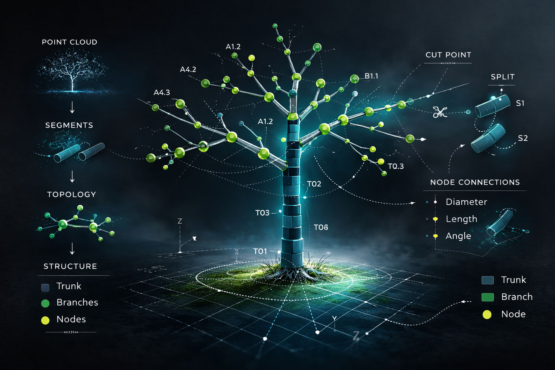 Zunächst werden fehlorientierte Segmente automatisch erkannt und korrigiert, sodass eine konsistente Flussrichtung vom Stammfuß zur Baumkrone entsteht. Anschließend werden strukturelle Knoten identifiziert, indem Endpunkte innerhalb definierter Toleranzen zusammengeführt werden. Lose Enden werden analysiert, projiziert und – wenn geometrisch plausibel – verbunden. Erst nachdem eine stabile Knoteninfrastruktur etabliert ist, erfolgt die hierarchische Klassifikation in Stamm, Äste und Zweige. Diese Umkehrung – Topologie vor Hierarchie – erwies sich als robuster gegenüber Scanartefakten und Segmentfehlern.